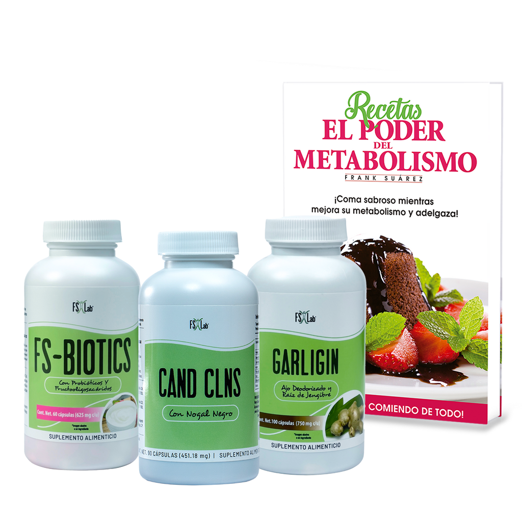 Este kit  tiene una presentación en cápsulas, contiene 1 bote de FS-Biotics de 60 cápsulas y 1 bote de CANDS-CLNS  de 90 cápsulas y  1 bote de GARLIGIN de 100 cápsulas. Incluye el libro "Recetas El Poder Del Metabolismo."