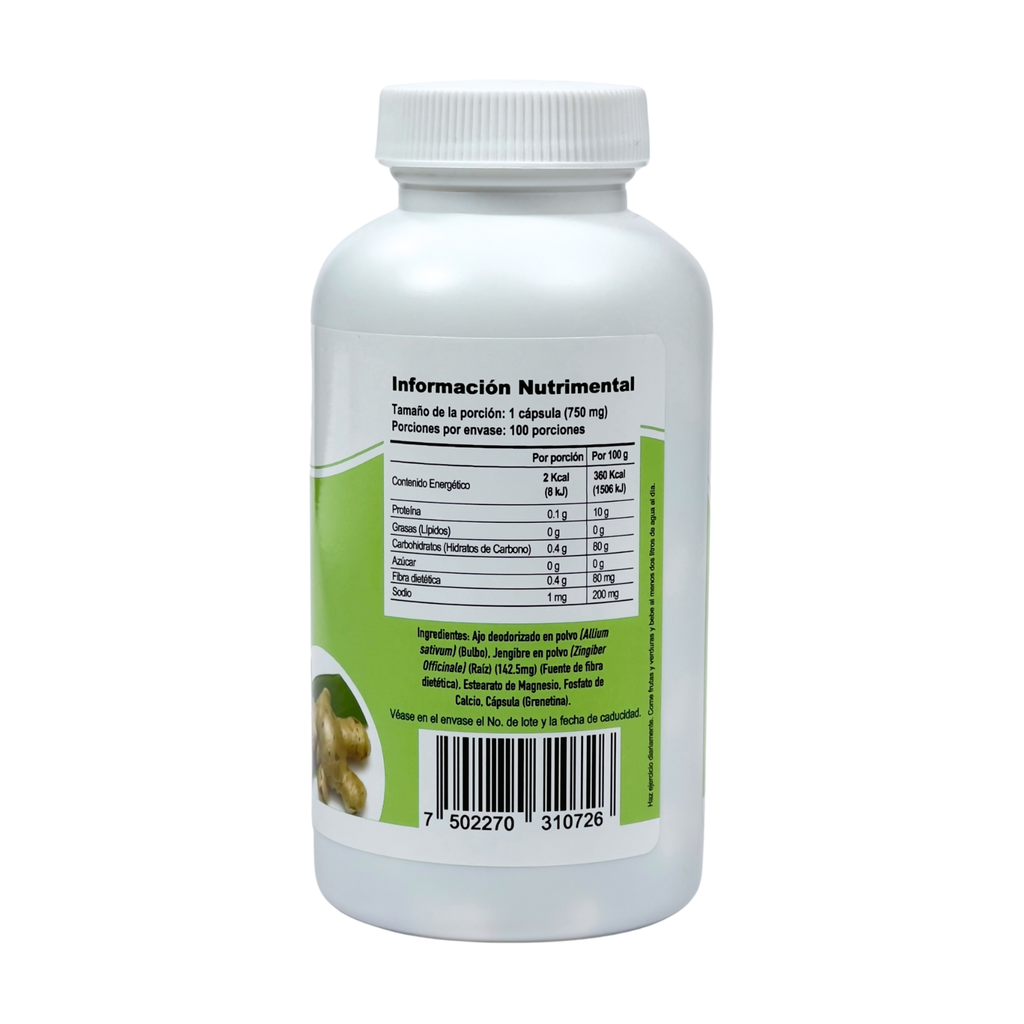 Cada cápsula contiene 600mg de ajo deodorizado y 100mg de polvo de jengibre.